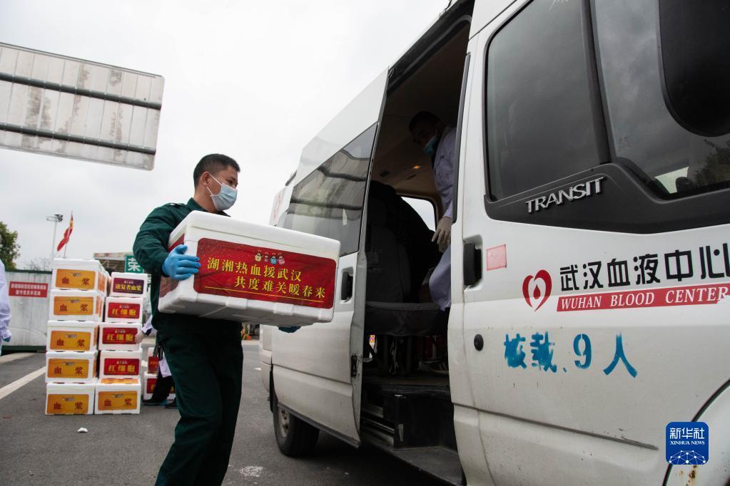 在湖南岳阳荣家湾收费站出口,湖南省血液中心工作人员把支援湖北省的临床用血搬运到湖北血液中心的车辆上(2020年3月30日摄)。新华社记者 陈思汗 摄