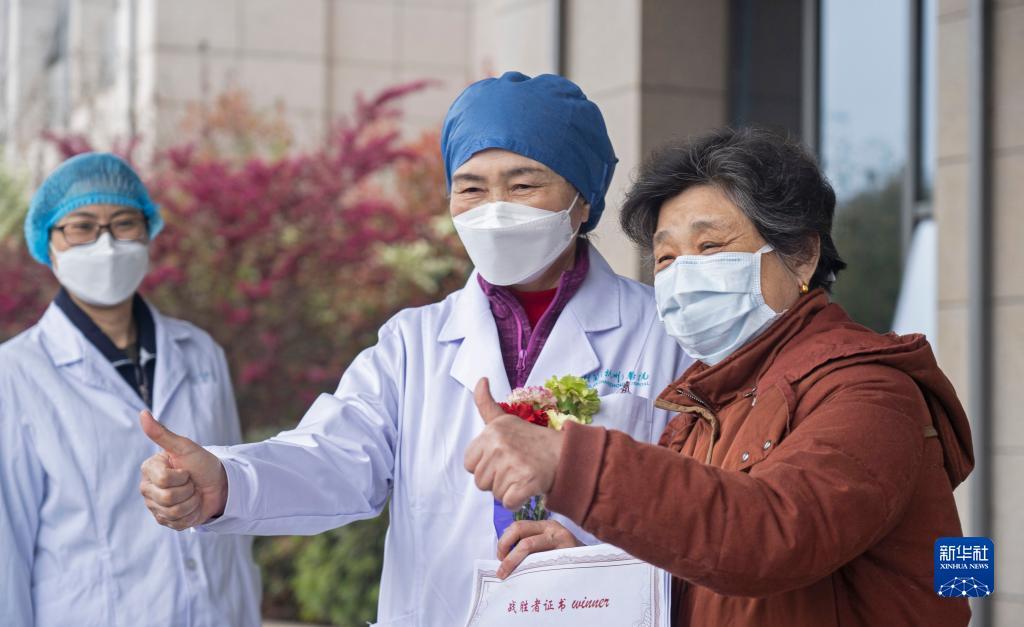 李兰娟院士(中)与武汉大学人民医院东院区第600名出院的新冠肺炎患者谢大姐合影(2020年3月16日摄)。新华社记者 才扬 摄