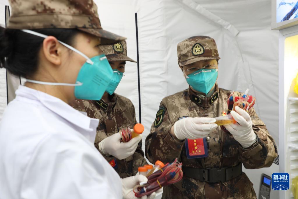 中国工程院院士陈薇(右)在搭建的负压帐篷实验室检查血清分离(2020年3月26日摄)。新华社发(张振威 摄)