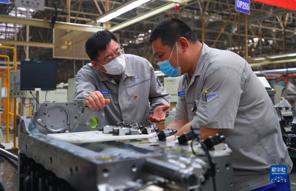 一汽解放大连柴油机有限公司的高级技师鹿新弟(左)在车间与同事交流(2020年5月7日摄)。新华社记者 龙雷 摄