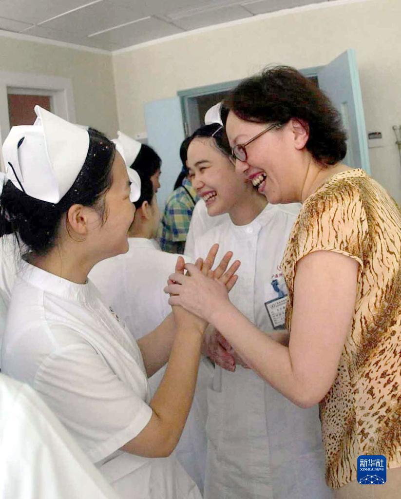 2003年7月2日,广州医学院第一附属医院最后出院的3名“非典”患者之一(右一)向白衣天使们表示感谢。新华社记者 陈学思 摄