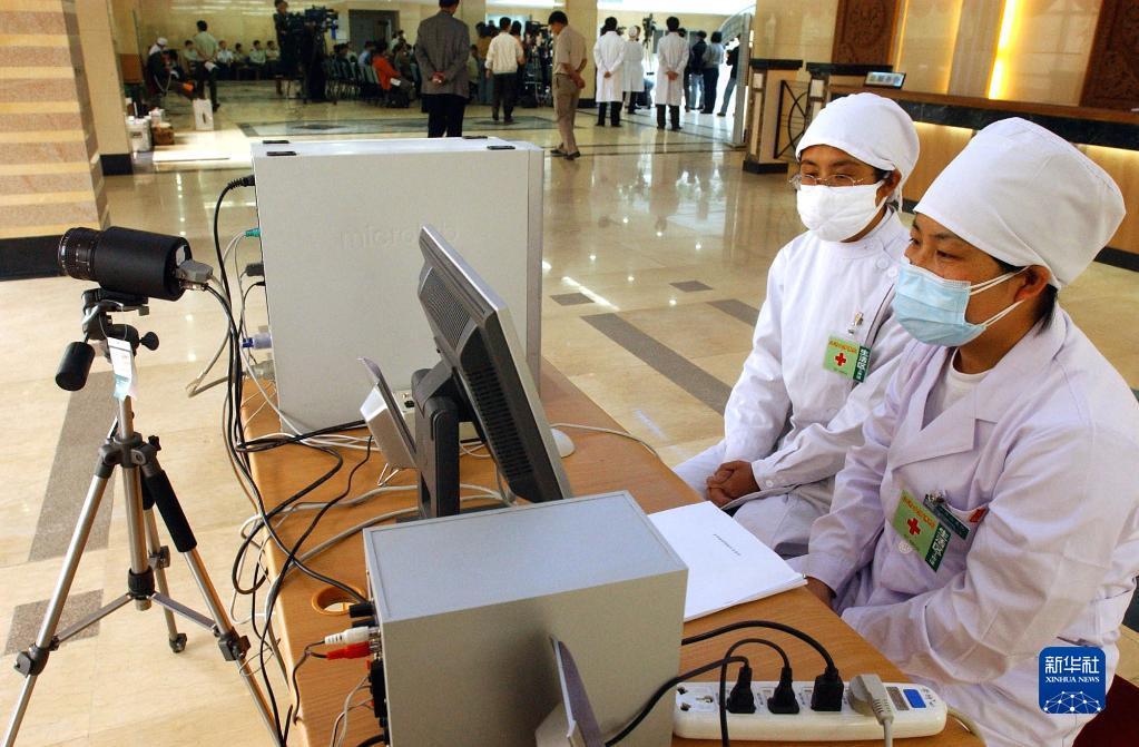 2003年5月7日,北京小汤山“非典”定点医院的两名工作人员在医院进出口通过红外热成像系统对进出人员进行体温监测。新华社记者 王呈选 摄